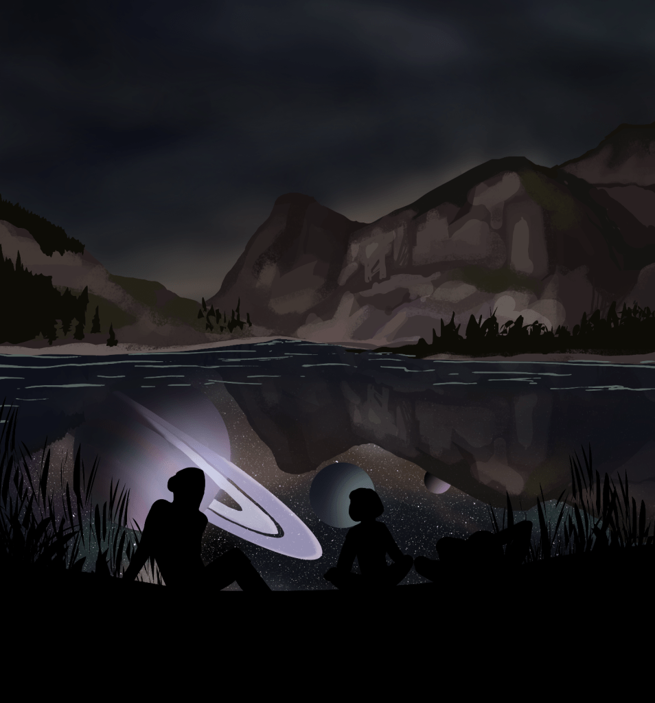 For a second I thought I was imagining them. I looked up at the sky and saw nothing but clouds. But when I looked back down at the lake, stars. More than I’ve ever seen in my life, great, swirling, colorful, swaths of stars. But what I was seeing didn’t fully set in until I saw the planet. It was bigger than the moon, and had rings.
