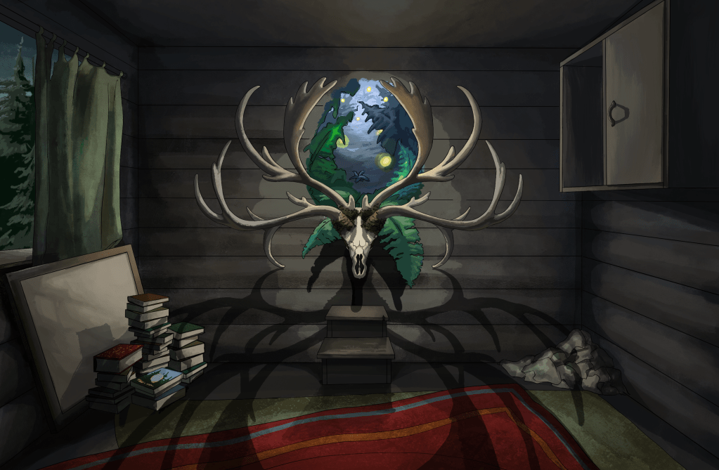 It was messy inside, dusty, old bones and supplies scattered across the floor, but on the wall at the far end of the cabin, two enormous, strange antlers were mounted on the wall, and in the space between them where there should have been wall…
